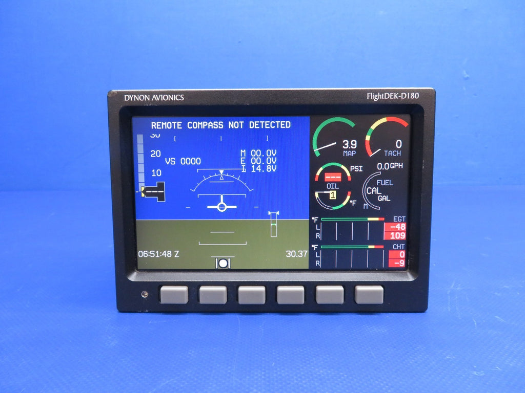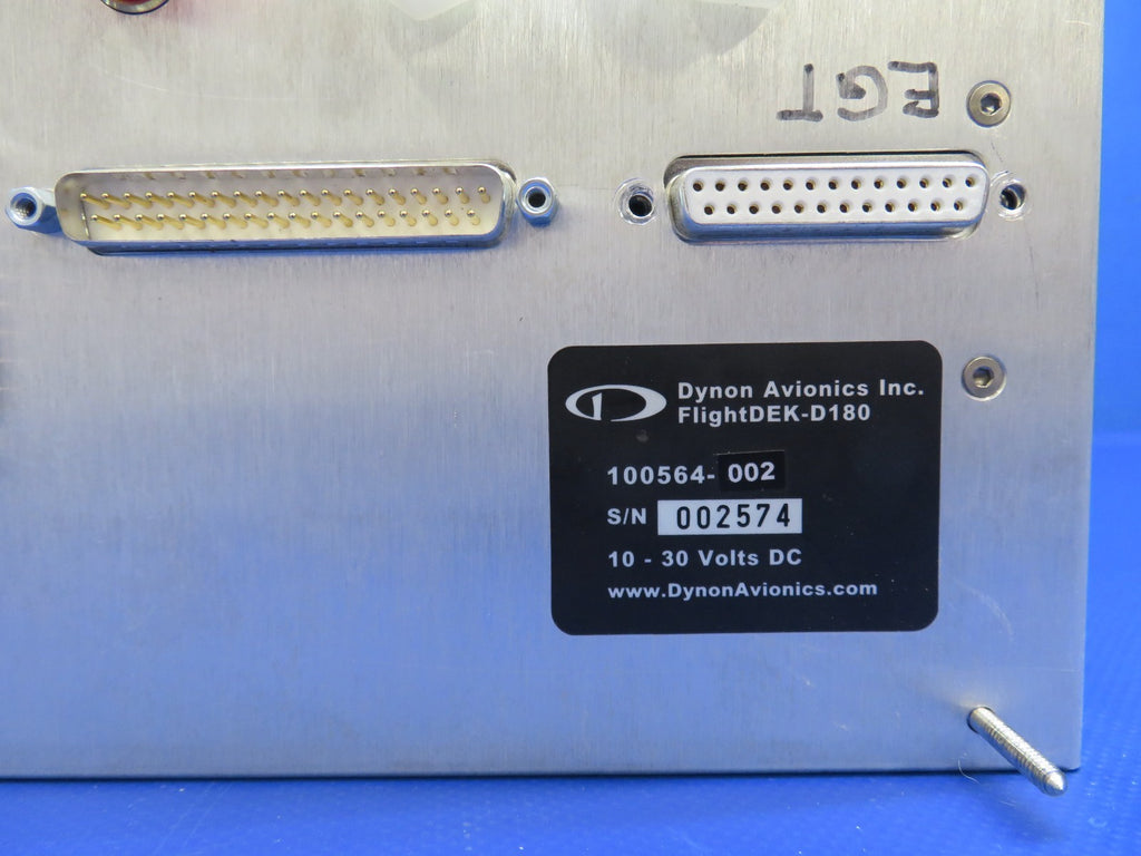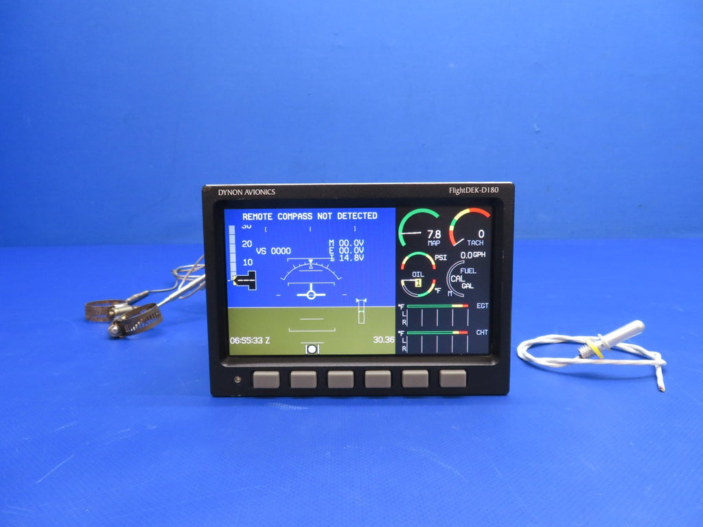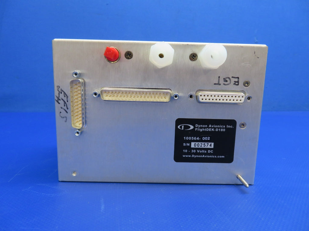 Dynon FlightDEK-D180 with Connectors and 2 EGT Probes. 10-30 Volts. P/N 100564-002. S/N 002574. EGT Probes P/N 10045-001. Removed from Pilot Side Panel. Working when removed. Removed in good condition from a parted out 2011 Vans Aircraft RV-12 S/N 120219, N813JC. TTAF 398.7. Guaranteed to pass inspection or your money back.