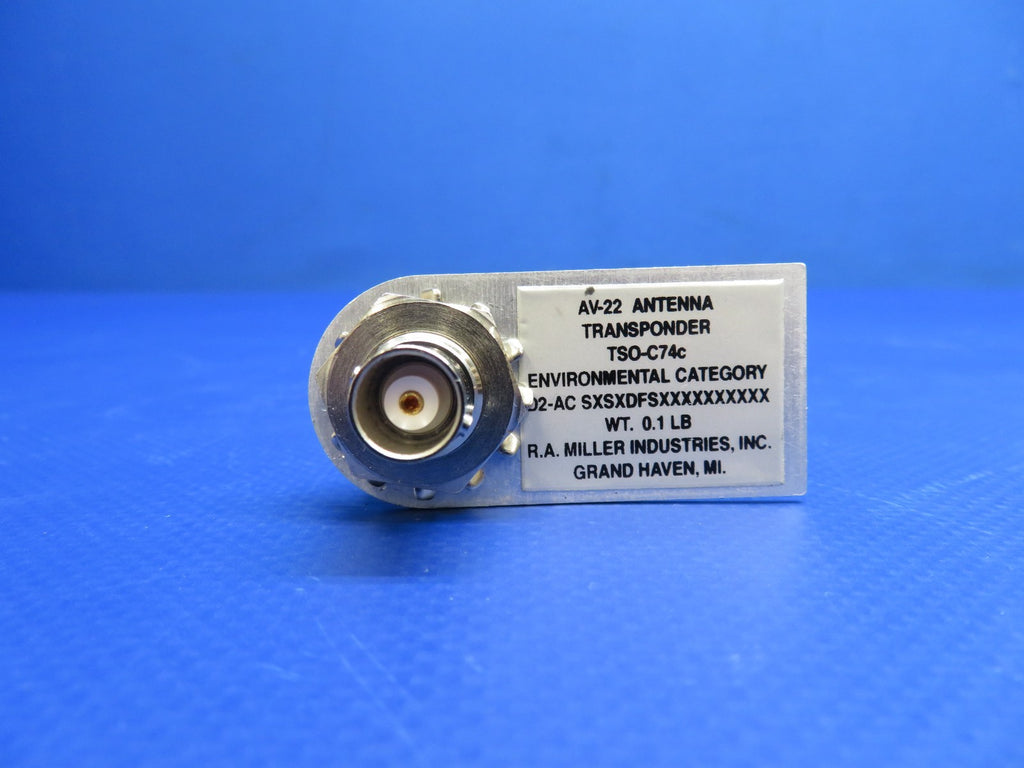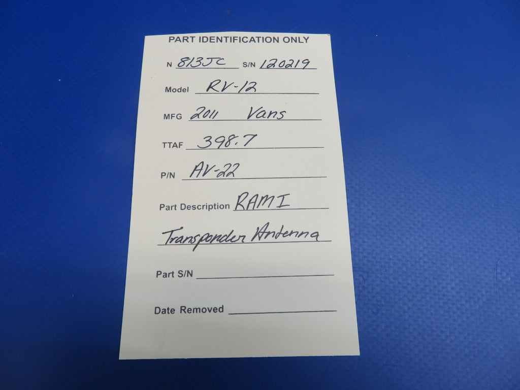 Van's Aircraft RV-12 RA Miller (RAMI) Transponder Antenna. P/N AV-22. Removed in good condition from a parted out 2011 Vans Aircraft RV-12 S/N 120219, N813JC. TTAF 398.7. Guaranteed to pass inspection or your money back.