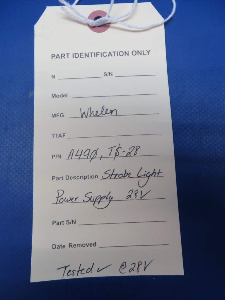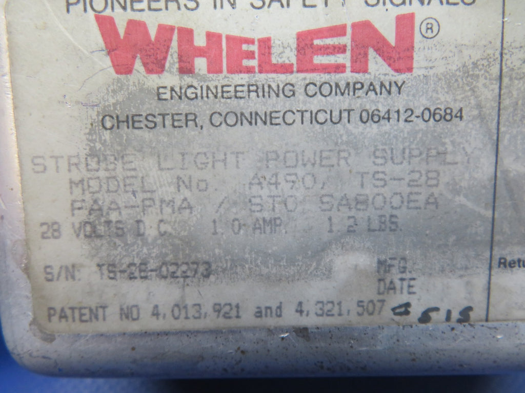 Whelen Strobe Light Power Supply 28v. P/N A490, TS-28. This item was recently tested 28v and found to be in working condition. Guaranteed to pass inspection or your money back.
